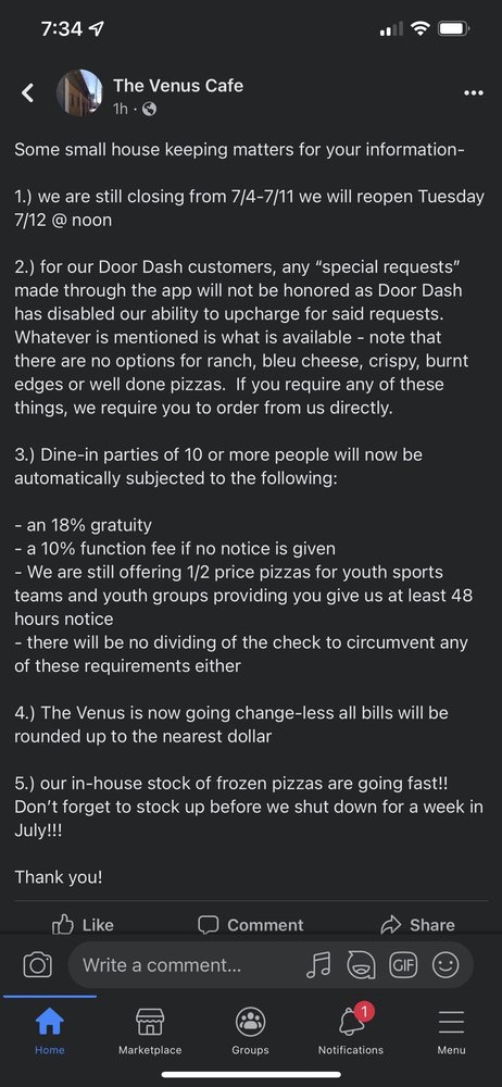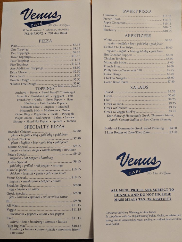 Welcome to Venus Cafe Whitman, a hidden gem located at 47 South Ave, Whitman, MA. Specializing in bar-style pizza, this cafe offers an impressive menu that emphasizes unique and delicious flavors. Their standout specialty pizzas include the Not Big Mac Pizza, featuring a delightful combination of hamburger, lettuce, onion, and pickle with Thousand Island dressing, and the adventurous Chicken & Waffle Pizza, which tantalizes with chopped breaded chicken and waffles drizzled in maple syrup. Each pizza is crafted with care—no modifications allowed, ensuring an authentic flavor experience.